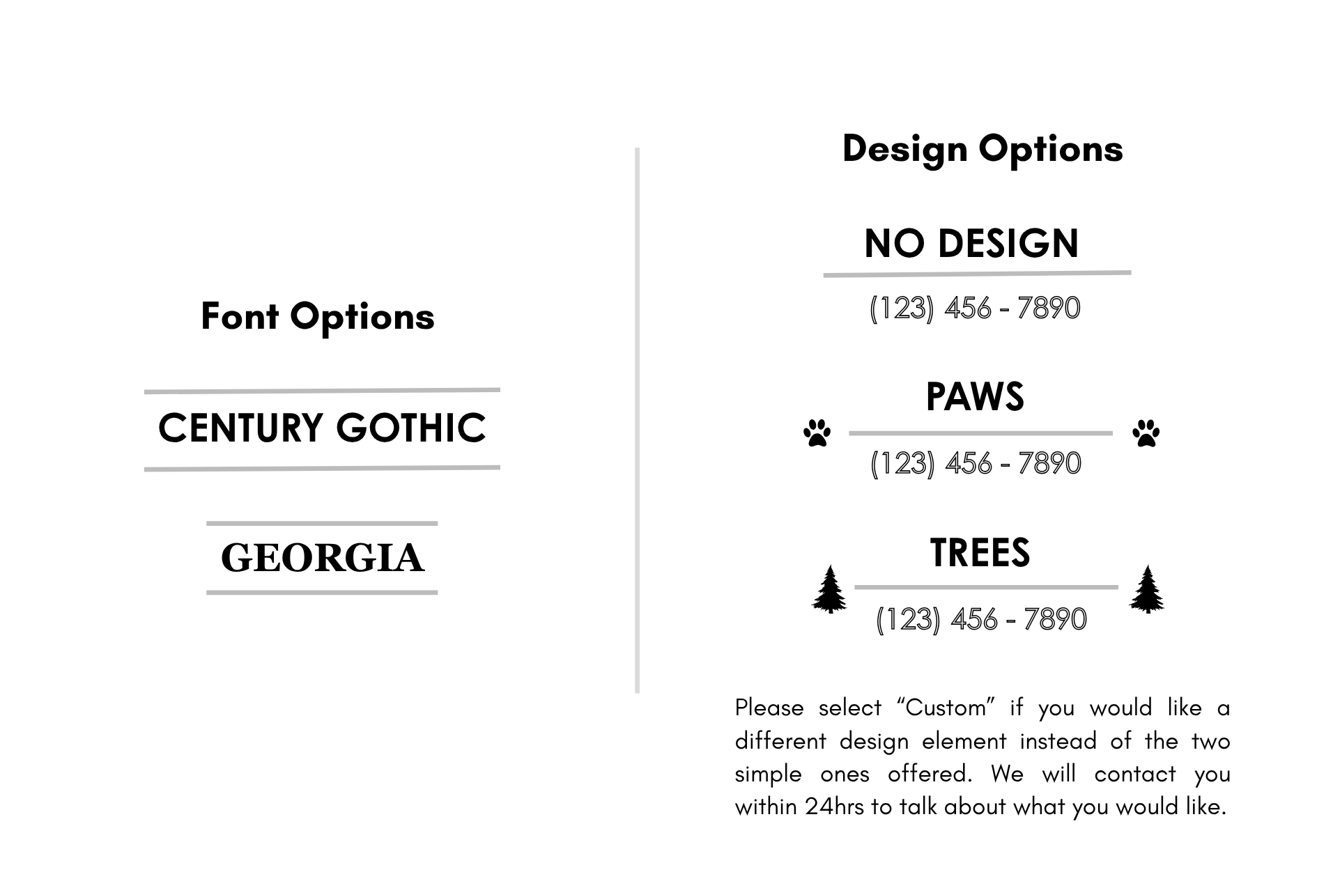 If you choose “Custom” for the design, we will contact you to discuss options within 24 hrs.