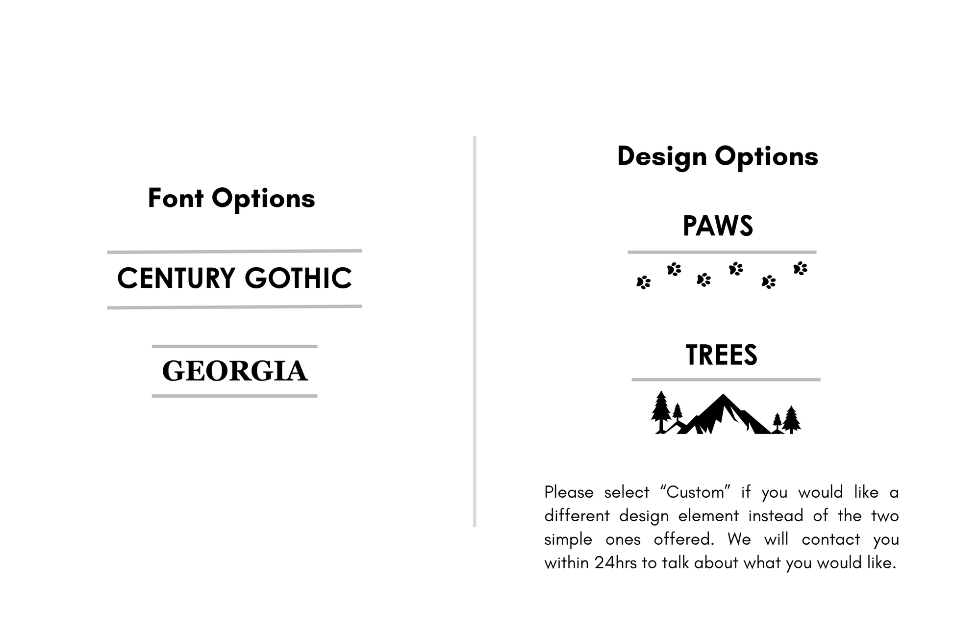 If you choose “Custom” for the design, we will contact you to discuss options within 24 hrs.